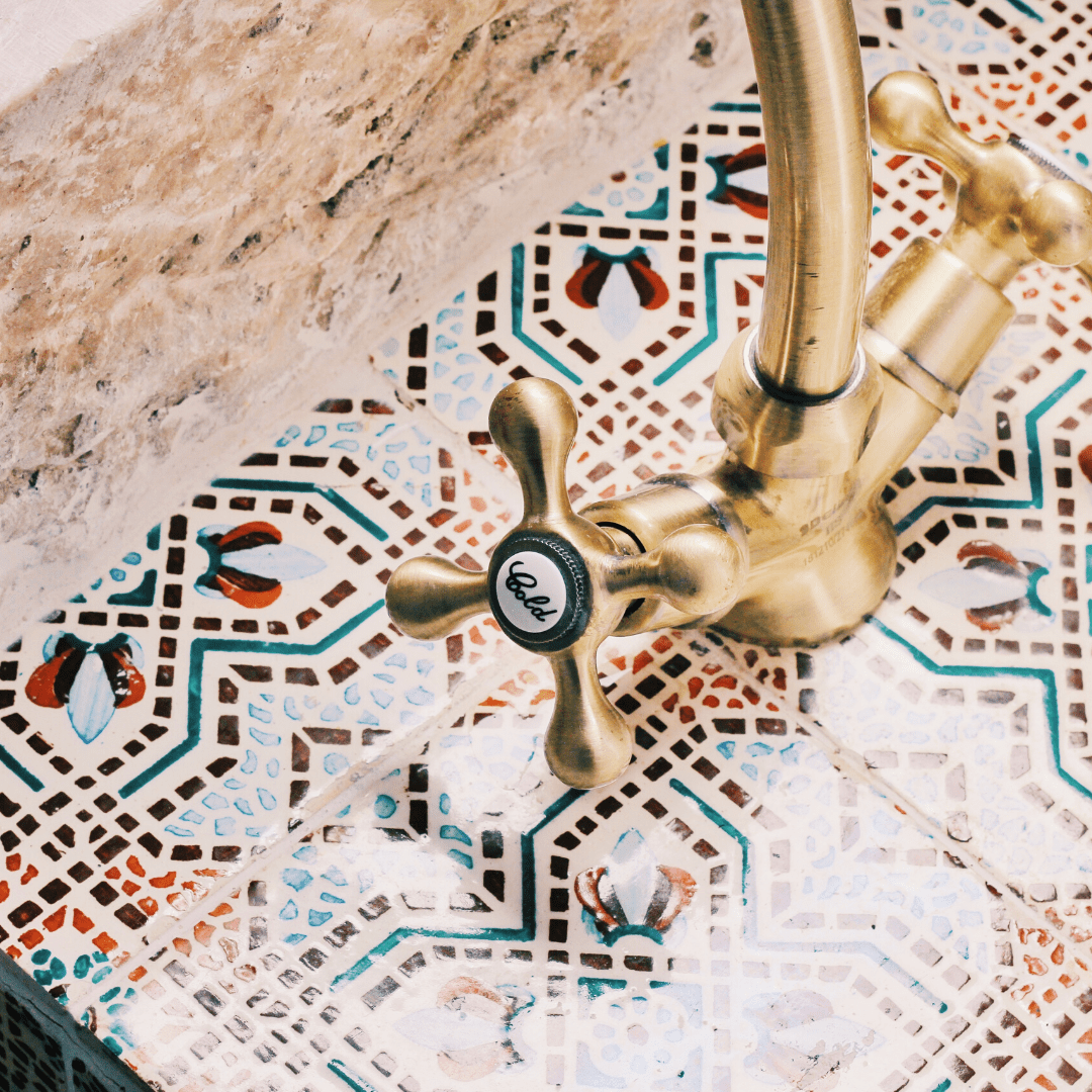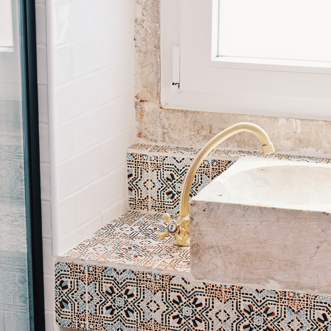 It took us a little while (and a lot of pinterest scrolling) to decide what kind of tiles we wanted on the walls. We found some gorgeous white rectangular tiles with a ripple effect from our favourite DIY store “Leroy Merlin” and we were sold. We loved how the ripple effect reminded us of the moving ocean and we wanted to keep things neutral with the white to let the antique tiles shine. In the shower cabin we flipped the tiles to section off that area and kept them straight for the rest of the walls.